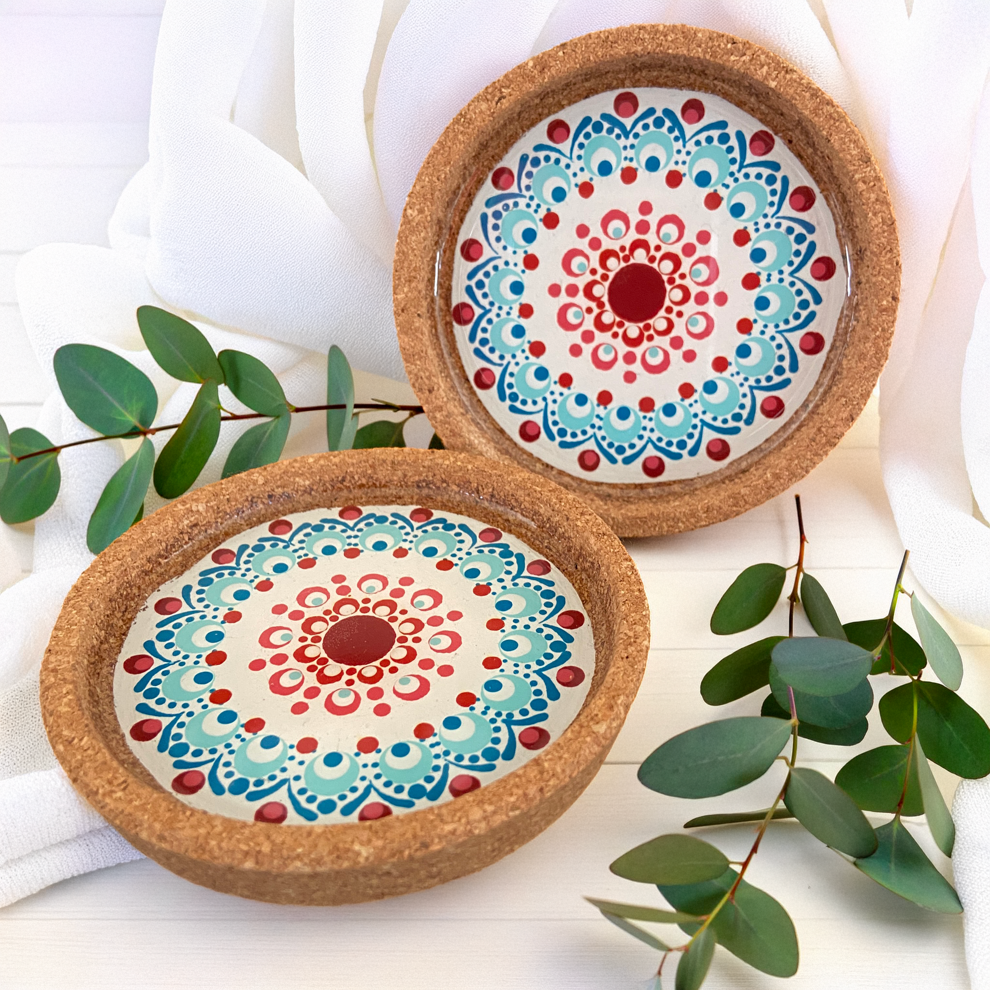 Deze handgestipte onderzetters van kurk zijn met zorg en aandacht gemaakt. Elk patroon is met de hand opgebouwd, waardoor iedere onderzetter uniek is. De afwerking met een laagje epoxy zorgt voor bescherming en een subtiele glans.
